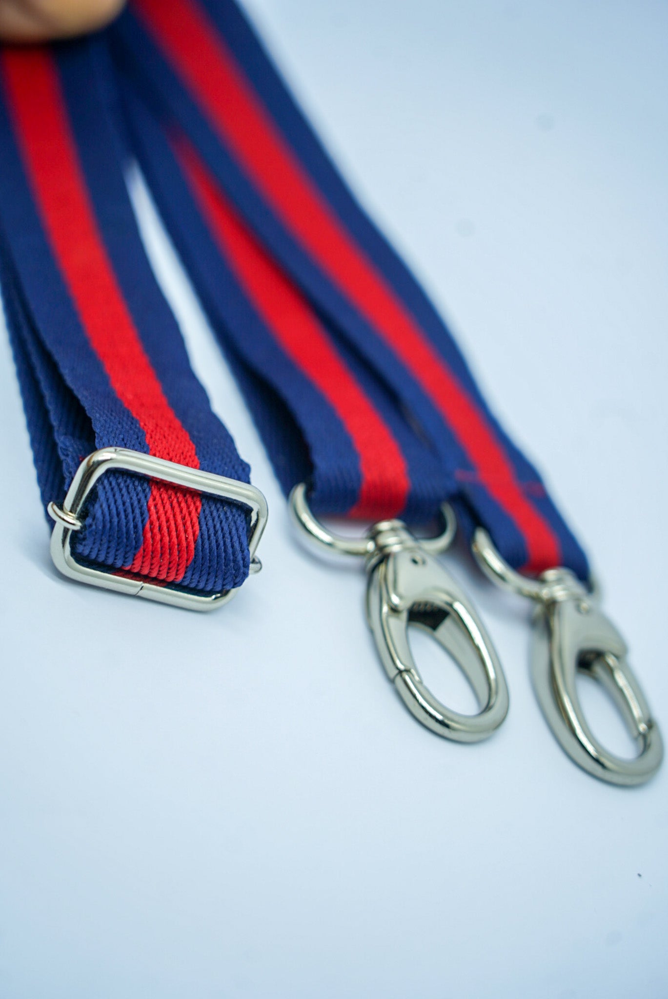 Alça listrada em poliester com mosquetões em metal prateado, possui regulagem para ser usada à tiracolo ou na transversal na medida que preferir.