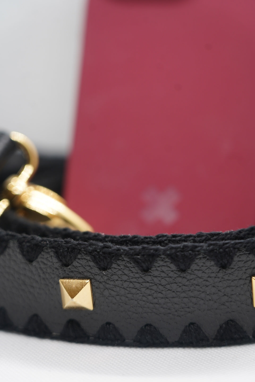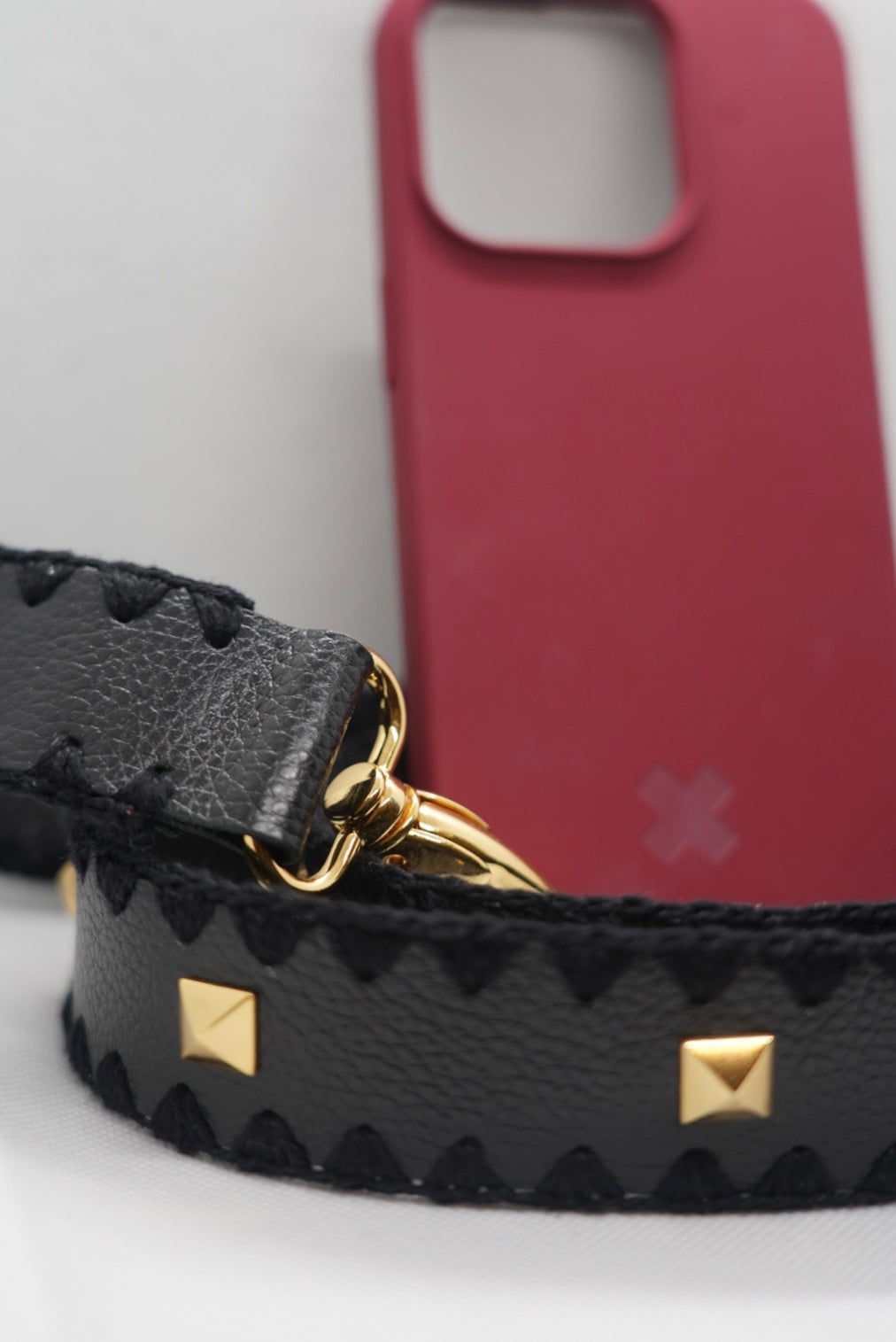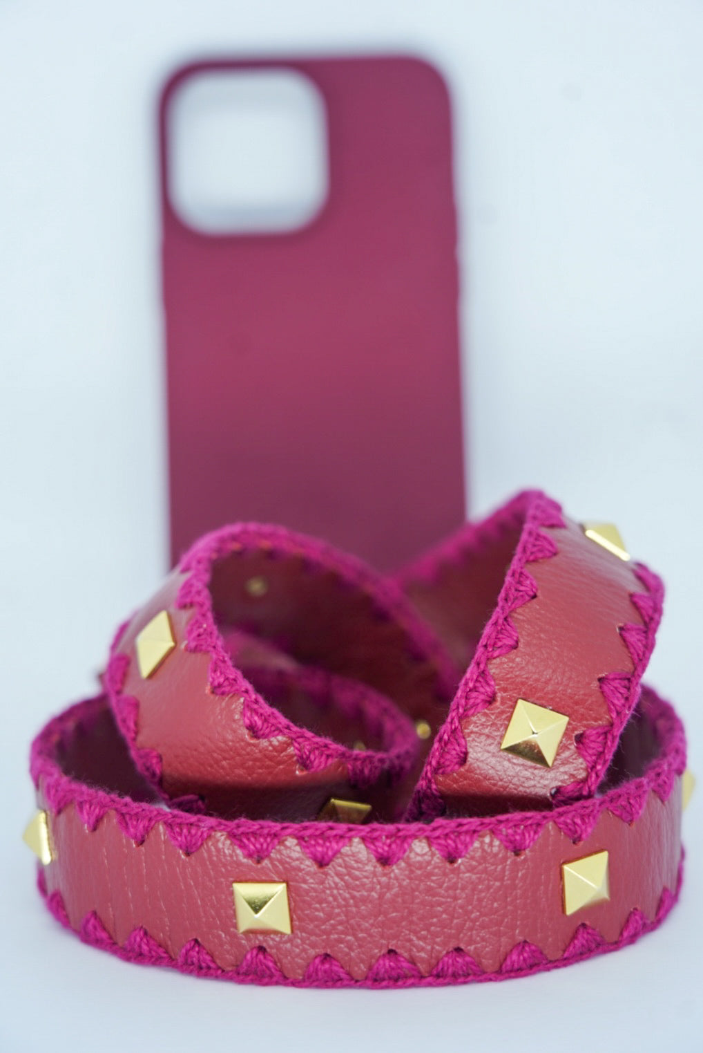Alça feita artesanalmente em couro, acabamento em crochê e aplicação de spikes dourados, pode ser usada à tiracolo ou transversal .