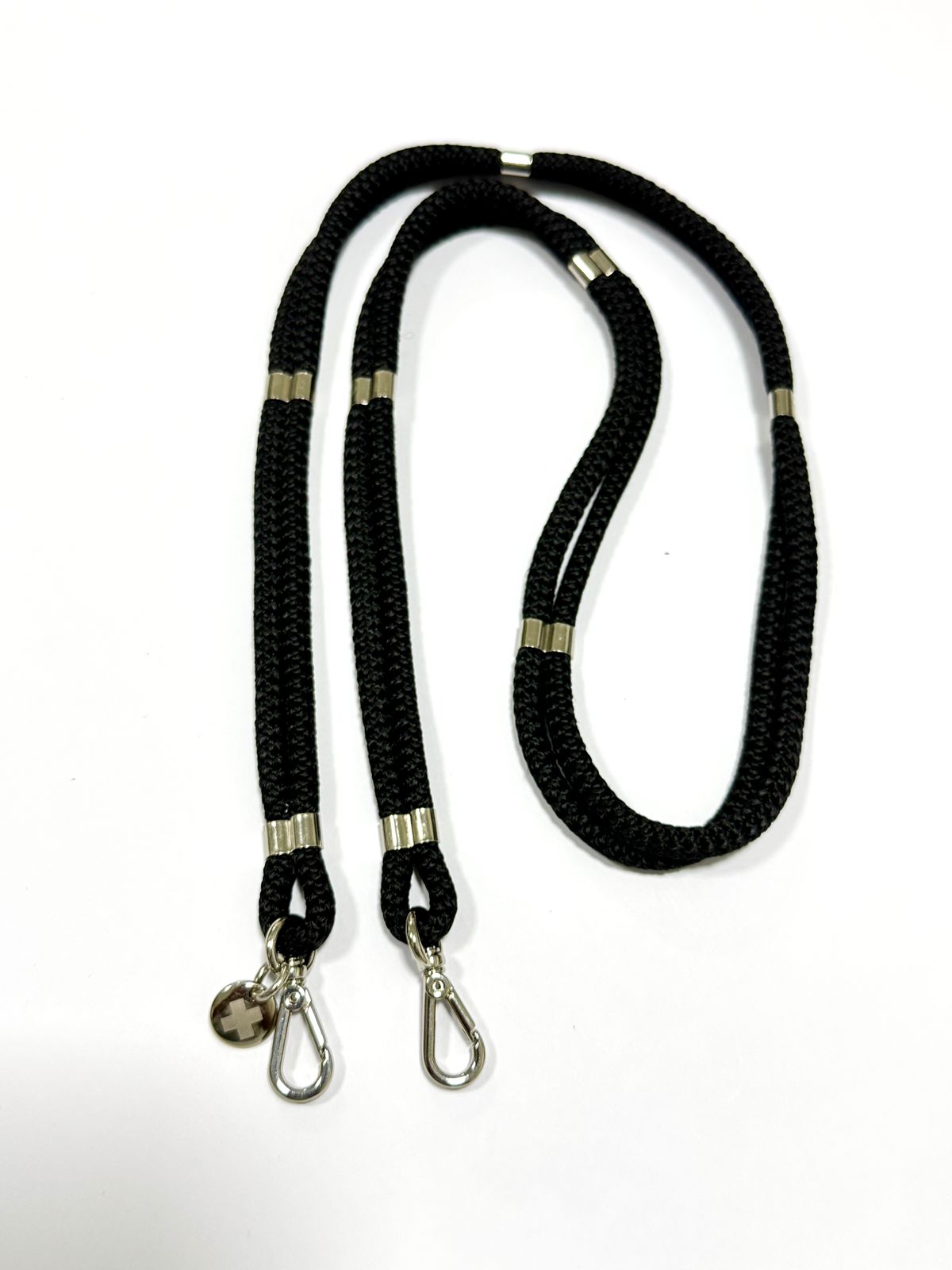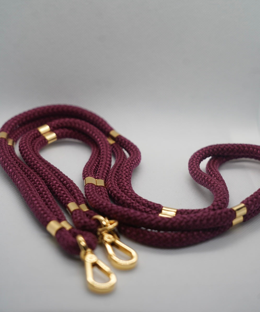 Alça de corda dupla com passadores e mosquetões em metal dourado ou prateado. Pode ser usada à tiracolo ou transversal, ótima opção em momentos em que as mãos devem estar livres.