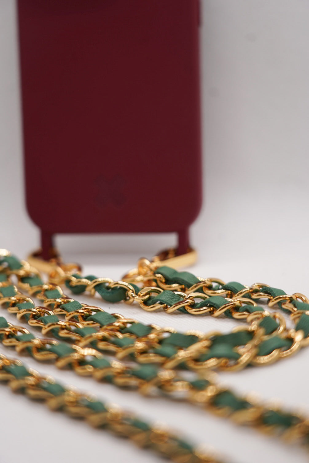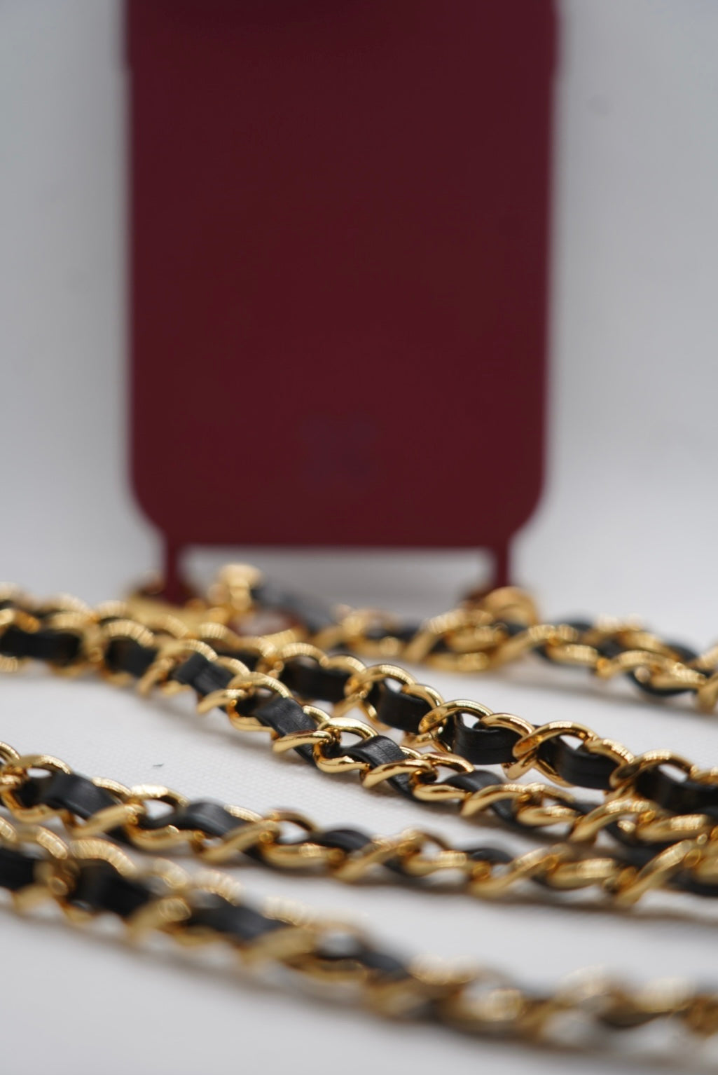 Alça de corrente em metal e courino entrelaçado, pode ser usada à tiracolo ou transversal, ótima opção em momentos em que as mãos devem estar livres.