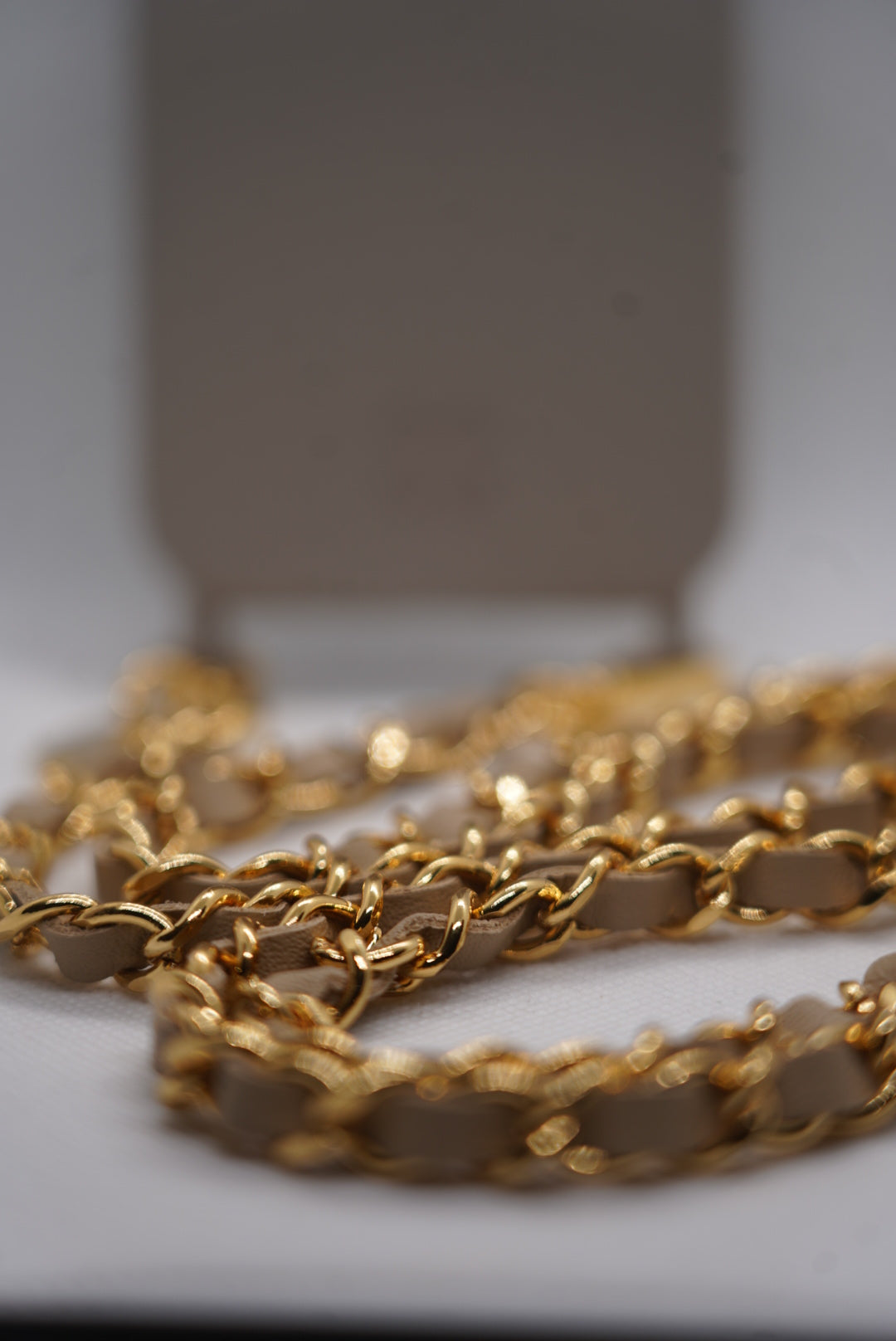 Alça de corrente em metal dourado e courino entrelaçado, pode ser usada à tiracolo ou na transversal, ótima opção em momentos em que as mãos devem estar livres.
