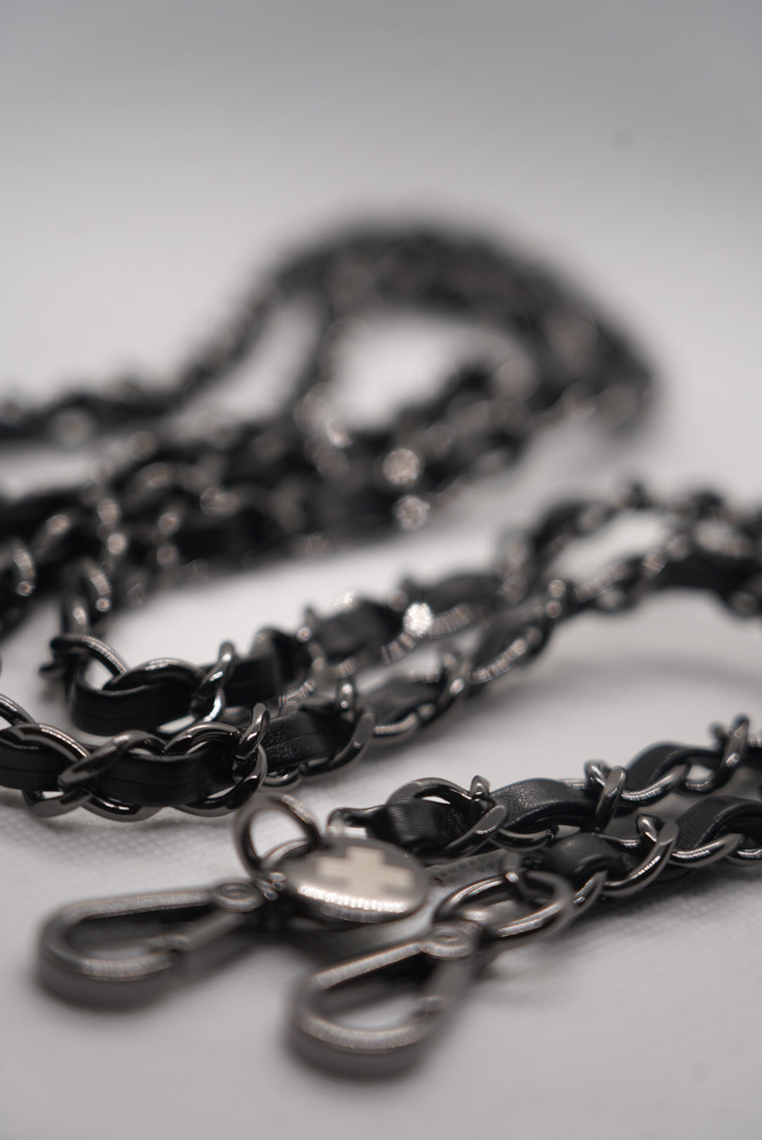 Alça de corrente em metal prateado e courino entrelaçado, pode ser usada à tiracolo ou na transversal, ótima opção em momentos em que as mãos devem estar livres.