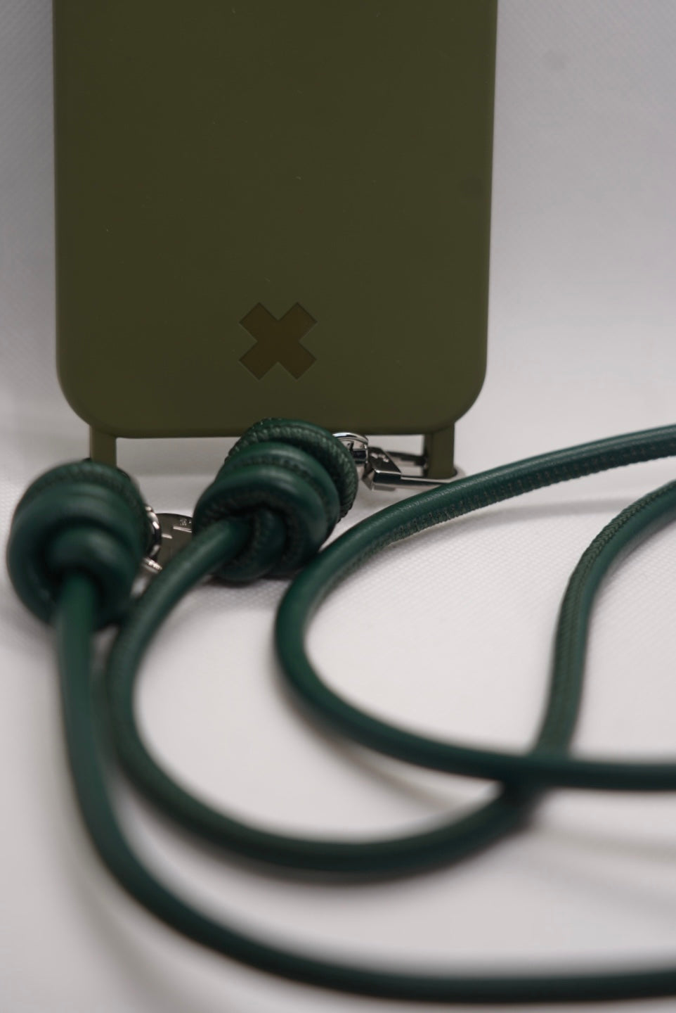 Alça de celular em courino verde militar, com mosquetões prateados. Perfeita para ficar com as mãos livres.